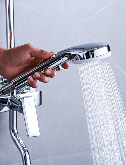 ② 手持花洒缓停按钮,人性化设计,保障持续恒温出水,一按就停,给小孩洗澡非常方便。